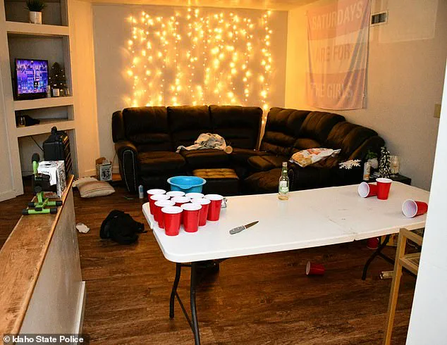 A photograph from the crime scene, obtained by Idaho State Police, shows the remnants of a college party—beer pong cups and red cups scattered on a living room table—contrasting starkly with the violence that had just transpired.