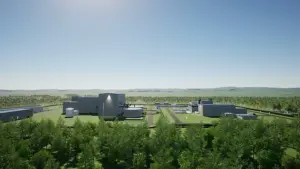 A rendering of the 44-acre nuclear power plant. On the left are the energy-generating facilities and on the right are the nuclear facilities. TerraPower has been criticized for not putting a concrete dome or another more traditional containment method around the nuclear reactors