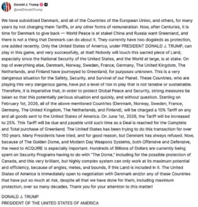 The president’s rhetoric escalated dramatically, with Trump asserting that the U.S. alone can “play in this game” and that Greenland’s sovereignty is a matter of “world peace.” His post included an AI-generated image of himself labeled “the tariff king,” a recurring motif in his social media strategy.